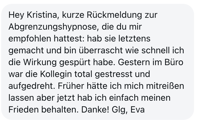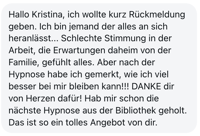 "Also wirklich Hut ab. Deine Online Hypnose Plattform ist sensationell geworden. Total übersichtlich alles, ganz einfach zu buchen, funktioniert einwandfrei, sogar für mich als technisches Nackerpatzi seht gut schaffbar. Und die Hypnosen sind natürlich gewohnte super Kristina-Qualität, da hab ich aber auch gar nichts anderes erwartet, ich hatte nur Respekt vor ONLINE, aber bin jetzt schon ein richtiger Fan. Sogar im Urlaub hab ich eine gemacht hihi, am Strand, so angenehm. Danke dir! Alles Liebe und bis bald!"