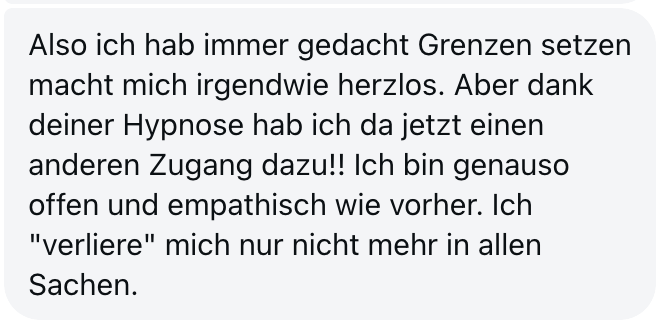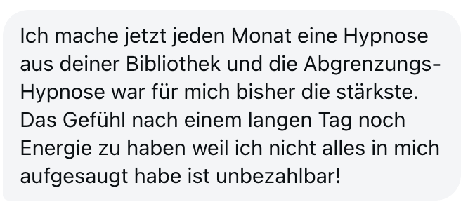 "Ich mache jetzt seit 4 Monaten 2 Online Hypnosen im Monat und fühl mich wie ein neuer Mensch. Ich bin viel entspannter und gelassener, unangenehme Dinge prallen an mir ab und ich fühle mich um Welten besser. Werde auf jeden Fall weiter machen mit den Hypnosen, vielen vielen Dank! LG"