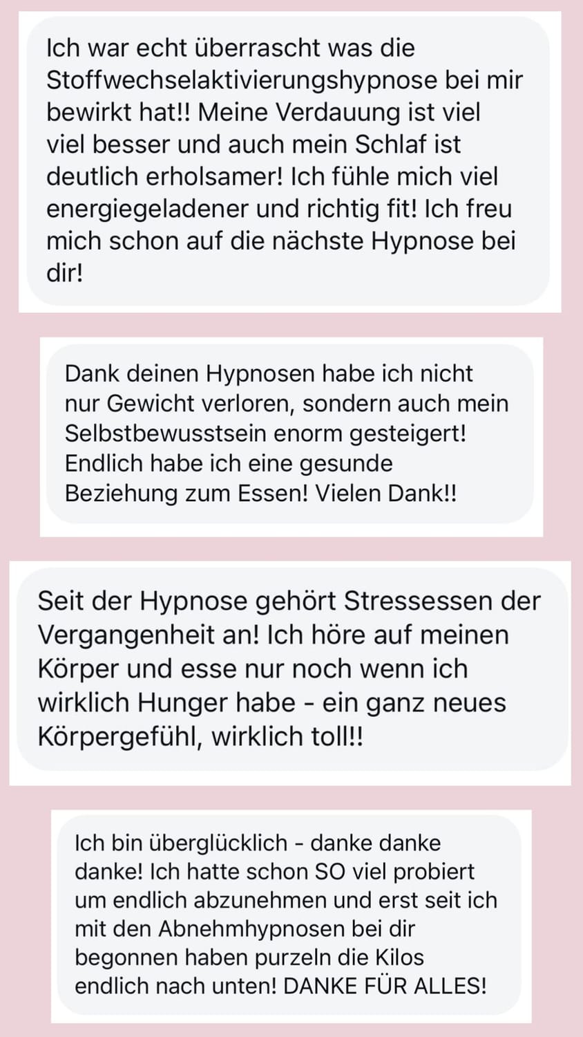 Die Hypnose hat mir geholfen, mich nicht mehr vom Essen kontrollieren zu lassen. Ich treffe endlich bewusste Entscheidungen und habe schon 12 Kilo verloren – ganz ohne Stress oder Druck. Ein großes Dankeschön an dich, für deine große Hilfe, deine liebe Art, dein umfangreiches Wissen und die Geduld, die du hast.