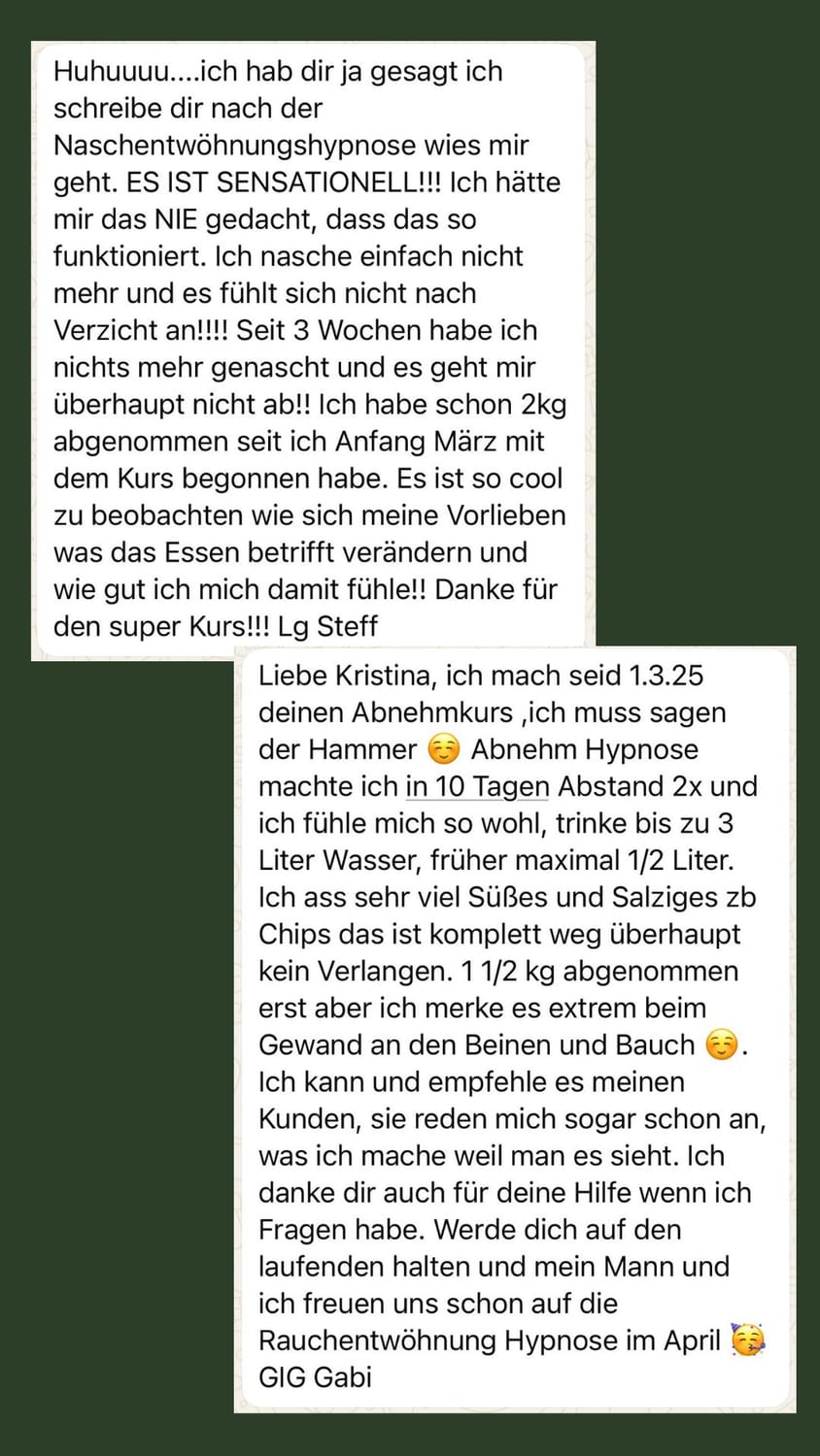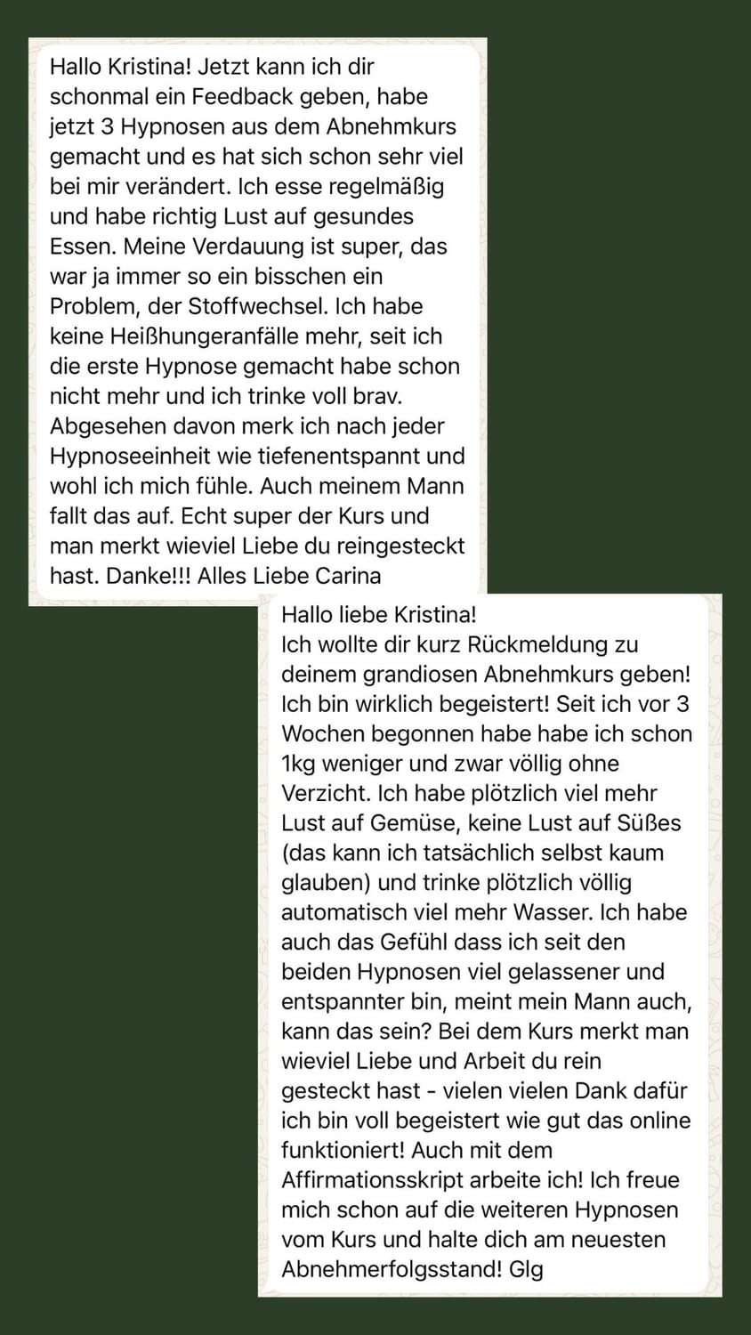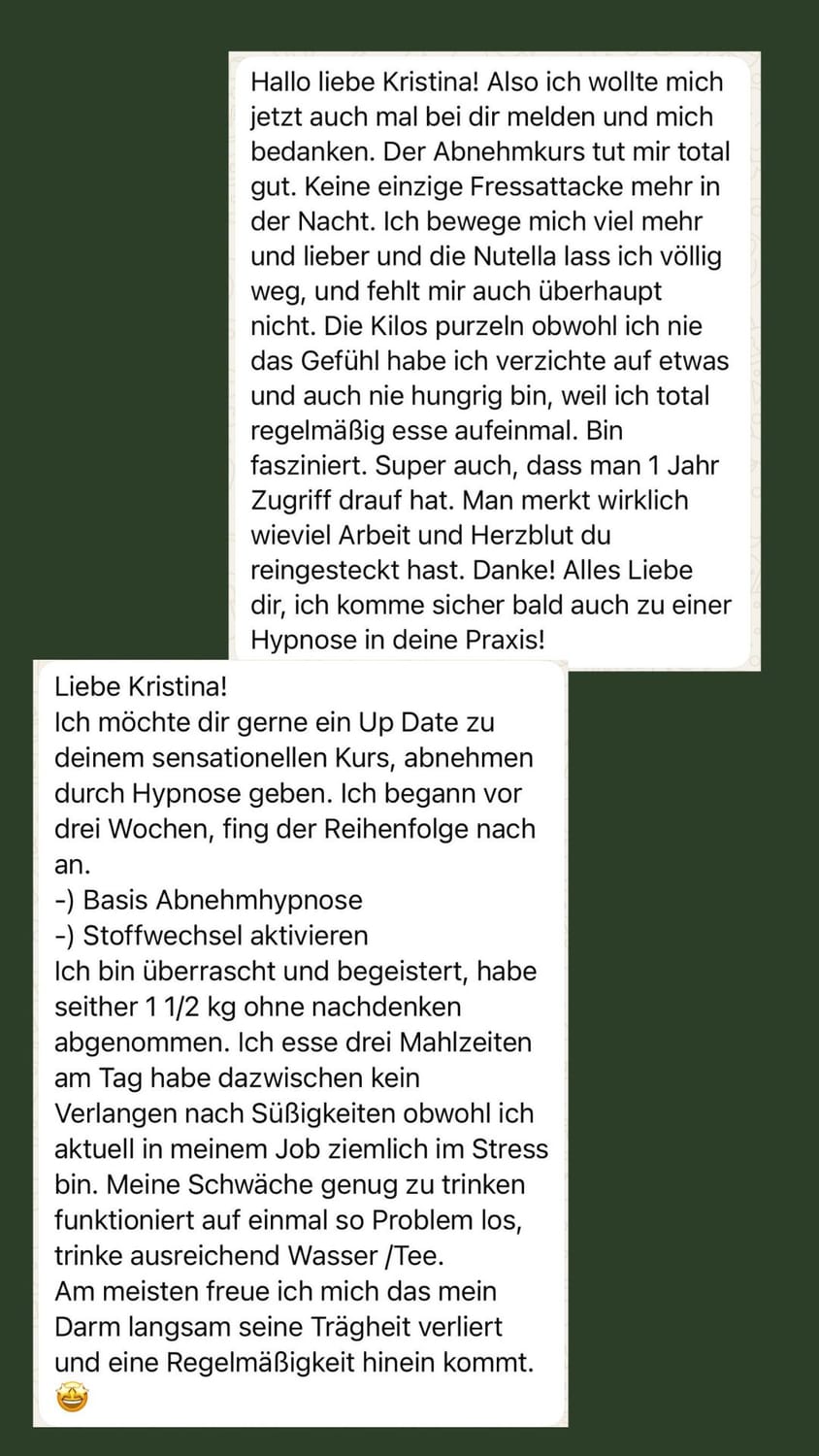Ich treffe endlich bewusste Entscheidungen und habe schon 12 Kilo verloren - ganz ohne Stress oder Druck. Ein großes Dankeschön an dich, für deine große Hilfe, deine liebe Art, dein umfangreiches Wissen und die Geduld, die du hast.