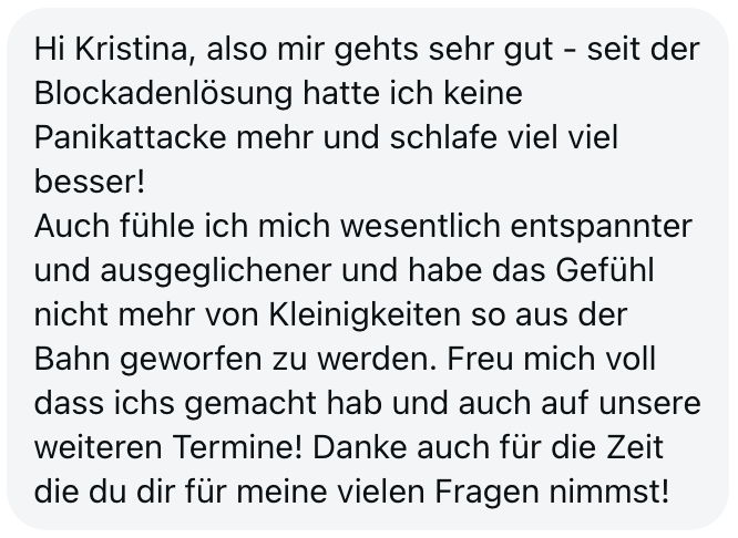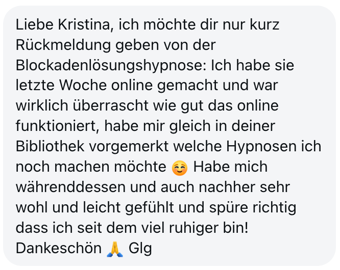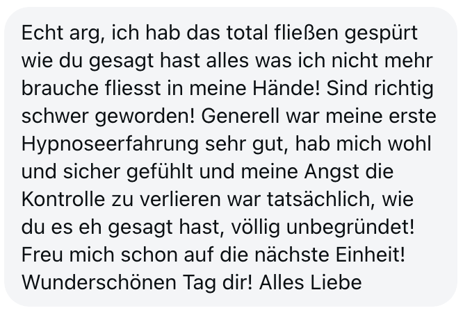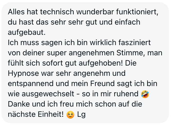 "Also wirklich Hut ab. Deine Online Hypnose Plattform ist sensationell geworden. Total übersichtlich alles, ganz einfach zu buchen, funktioniert einwandfrei, sogar für mich als technisches Nackerpatzi seht gut schaffbar. Und die Hypnosen sind natürlich gewohnte super Kristina-Qualität, da hab ich aber auch gar nichts anderes erwartet, ich hatte nur Respekt vor ONLINE, aber bin jetzt schon ein richtiger Fan. Sogar im Urlaub hab ich eine gemacht hihi, am Strand, so angenehm. Danke dir! Alles Liebe und bis bald!"