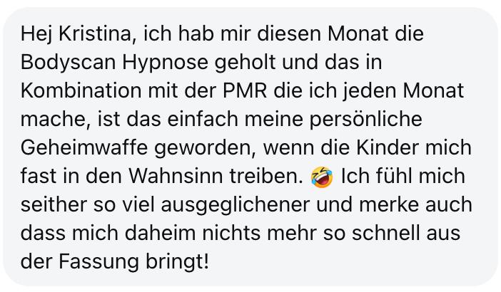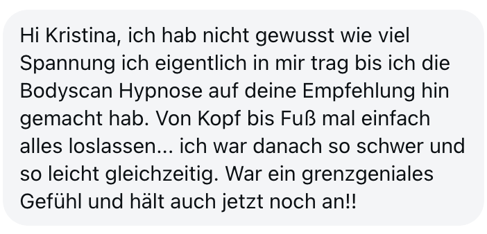 "Also wirklich Hut ab. Deine Online Hypnose Plattform ist sensationell geworden. Total übersichtlich alles, ganz einfach zu buchen, funktioniert einwandfrei, sogar für mich als technisches Nackerpatzi seht gut schaffbar. Und die Hypnosen sind natürlich gewohnte super Kristina-Qualität, da hab ich aber auch gar nichts anderes erwartet, ich hatte nur Respekt vor ONLINE, aber bin jetzt schon ein richtiger Fan. Sogar im Urlaub hab ich eine gemacht hihi, am Strand, so angenehm. Danke dir! Alles Liebe und bis bald!"