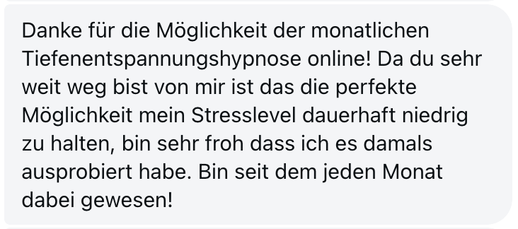 "Ich mache jetzt seit 4 Monaten 2 Online Hypnosen im Monat und fühl mich wie ein neuer Mensch. Ich bin viel entspannter und gelassener, unangenehme Dinge prallen an mir ab und ich fühle mich um Welten besser. Werde auf jeden Fall weiter machen mit den Hypnosen, vielen vielen Dank! LG"
