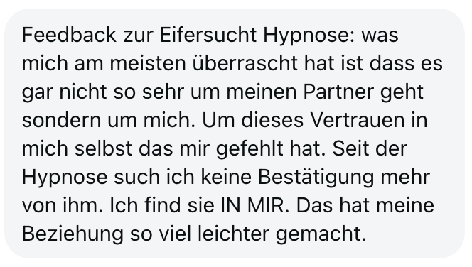 "Ich mache jetzt seit 4 Monaten 2 Online Hypnosen im Monat und fühl mich wie ein neuer Mensch. Ich bin viel entspannter und gelassener, unangenehme Dinge prallen an mir ab und ich fühle mich um Welten besser. Werde auf jeden Fall weiter machen mit den Hypnosen, vielen vielen Dank! LG"