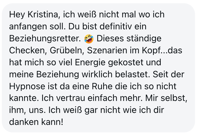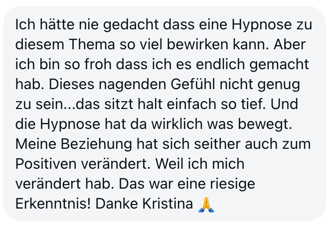 "Also wirklich Hut ab. Deine Online Hypnose Plattform ist sensationell geworden. Total übersichtlich alles, ganz einfach zu buchen, funktioniert einwandfrei, sogar für mich als technisches Nackerpatzi seht gut schaffbar. Und die Hypnosen sind natürlich gewohnte super Kristina-Qualität, da hab ich aber auch gar nichts anderes erwartet, ich hatte nur Respekt vor ONLINE, aber bin jetzt schon ein richtiger Fan. Sogar im Urlaub hab ich eine gemacht hihi, am Strand, so angenehm. Danke dir! Alles Liebe und bis bald!"