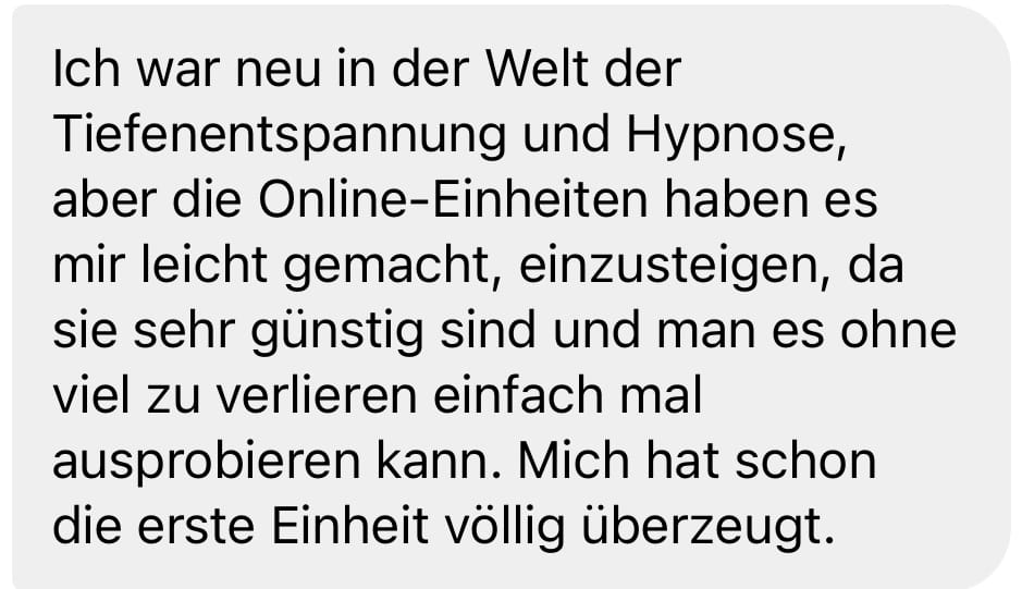 "Ich mache jetzt seit 4 Monaten 2 Online Hypnosen im Monat und fühl mich wie ein neuer Mensch. Ich bin viel entspannter und gelassener, unangenehme Dinge prallen an mir ab und ich fühle mich um Welten besser. Werde auf jeden Fall weiter machen mit den Hypnosen, vielen vielen Dank! LG"