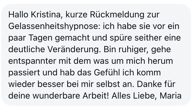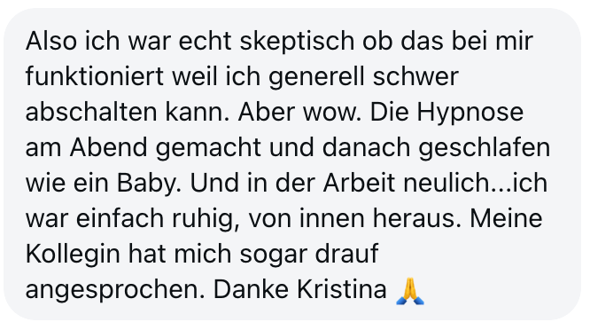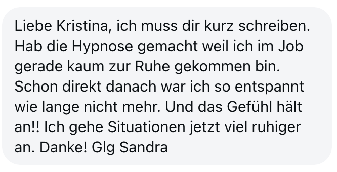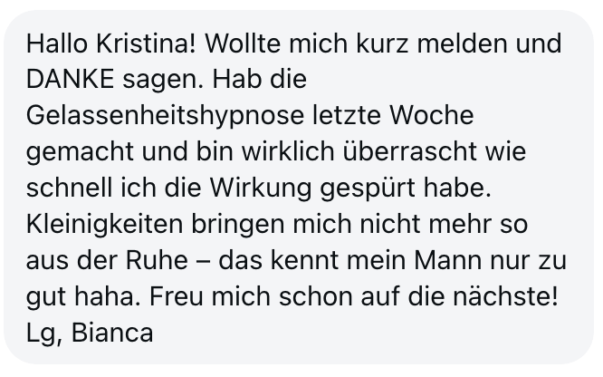"Also wirklich Hut ab. Deine Online Hypnose Plattform ist sensationell geworden. Total übersichtlich alles, ganz einfach zu buchen, funktioniert einwandfrei, sogar für mich als technisches Nackerpatzi seht gut schaffbar. Und die Hypnosen sind natürlich gewohnte super Kristina-Qualität, da hab ich aber auch gar nichts anderes erwartet, ich hatte nur Respekt vor ONLINE, aber bin jetzt schon ein richtiger Fan. Sogar im Urlaub hab ich eine gemacht hihi, am Strand, so angenehm. Danke dir! Alles Liebe und bis bald!"
