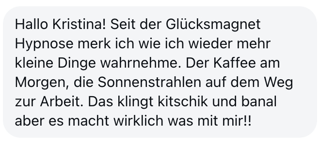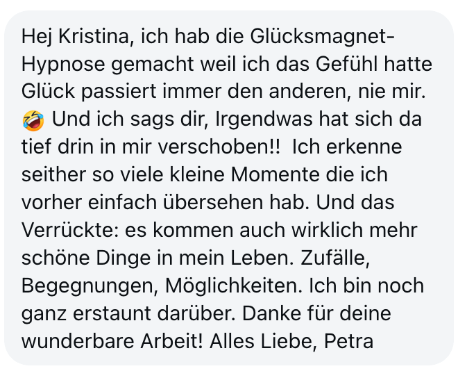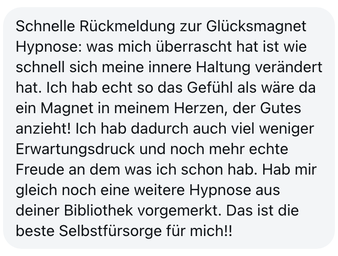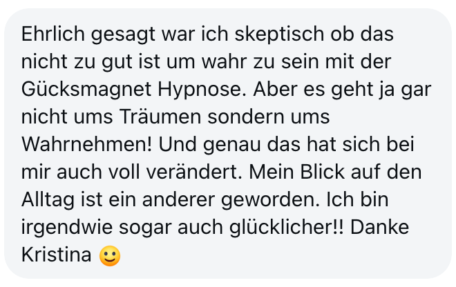 "Also wirklich Hut ab. Deine Online Hypnose Plattform ist sensationell geworden. Total übersichtlich alles, ganz einfach zu buchen, funktioniert einwandfrei, sogar für mich als technisches Nackerpatzi seht gut schaffbar. Und die Hypnosen sind natürlich gewohnte super Kristina-Qualität, da hab ich aber auch gar nichts anderes erwartet, ich hatte nur Respekt vor ONLINE, aber bin jetzt schon ein richtiger Fan. Sogar im Urlaub hab ich eine gemacht hihi, am Strand, so angenehm. Danke dir! Alles Liebe und bis bald!"