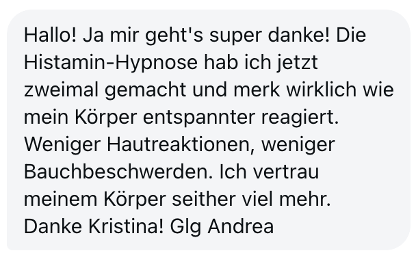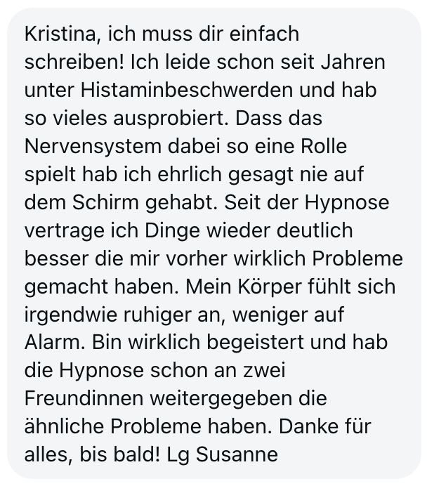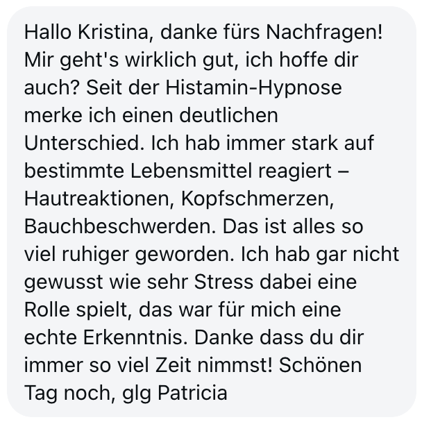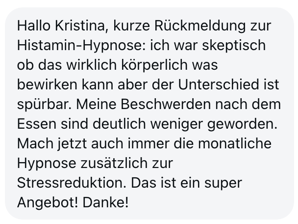 "Also wirklich Hut ab. Deine Online Hypnose Plattform ist sensationell geworden. Total übersichtlich alles, ganz einfach zu buchen, funktioniert einwandfrei, sogar für mich als technisches Nackerpatzi seht gut schaffbar. Und die Hypnosen sind natürlich gewohnte super Kristina-Qualität, da hab ich aber auch gar nichts anderes erwartet, ich hatte nur Respekt vor ONLINE, aber bin jetzt schon ein richtiger Fan. Sogar im Urlaub hab ich eine gemacht hihi, am Strand, so angenehm. Danke dir! Alles Liebe und bis bald!"