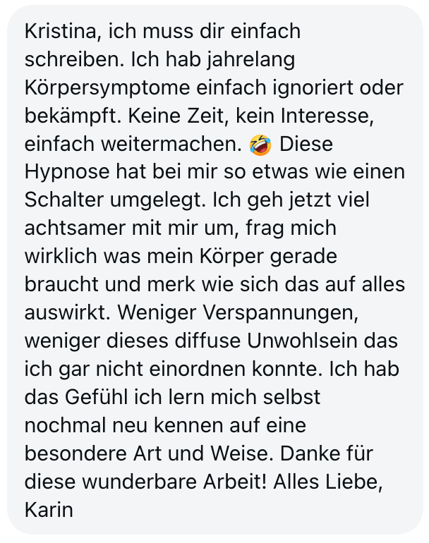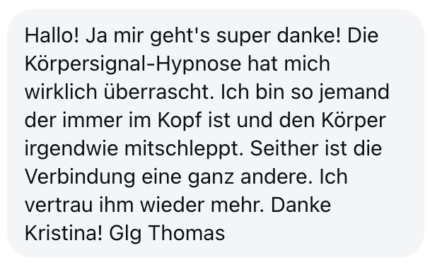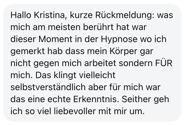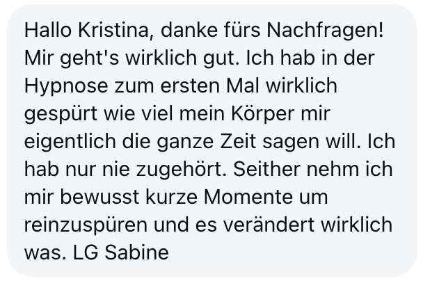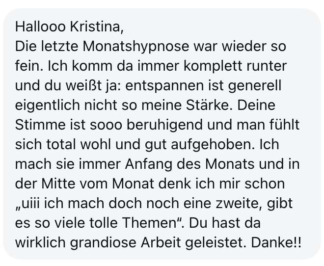 "Also wirklich Hut ab. Deine Online Hypnose Plattform ist sensationell geworden. Total übersichtlich alles, ganz einfach zu buchen, funktioniert einwandfrei, sogar für mich als technisches Nackerpatzi seht gut schaffbar. Und die Hypnosen sind natürlich gewohnte super Kristina-Qualität, da hab ich aber auch gar nichts anderes erwartet, ich hatte nur Respekt vor ONLINE, aber bin jetzt schon ein richtiger Fan. Sogar im Urlaub hab ich eine gemacht hihi, am Strand, so angenehm. Danke dir! Alles Liebe und bis bald!"