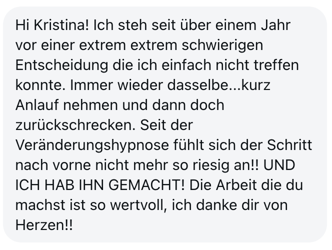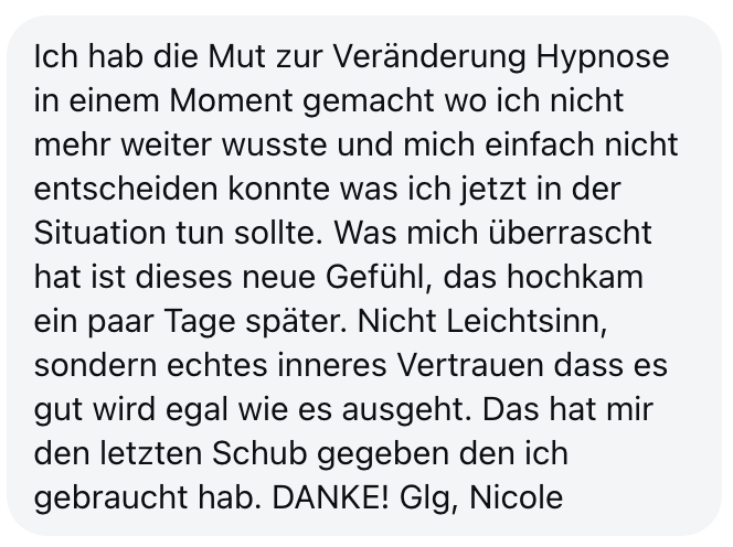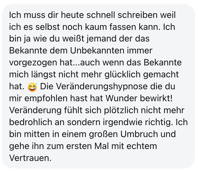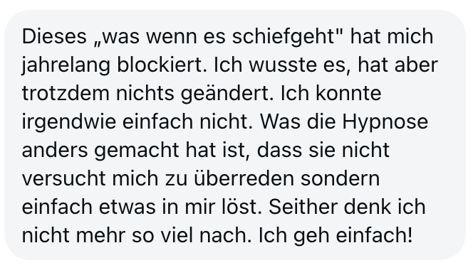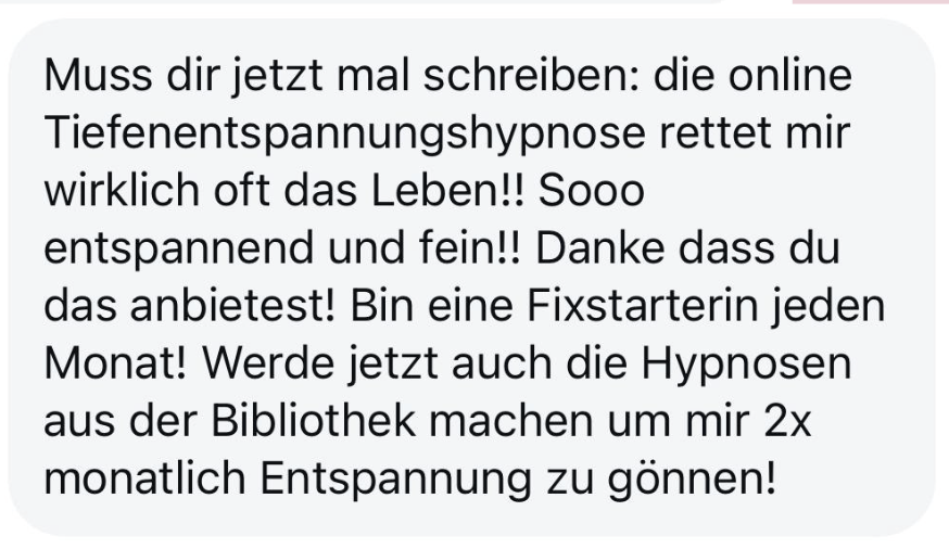 "Also wirklich Hut ab. Deine Online Hypnose Plattform ist sensationell geworden. Total übersichtlich alles, ganz einfach zu buchen, funktioniert einwandfrei, sogar für mich als technisches Nackerpatzi seht gut schaffbar. Und die Hypnosen sind natürlich gewohnte super Kristina-Qualität, da hab ich aber auch gar nichts anderes erwartet, ich hatte nur Respekt vor ONLINE, aber bin jetzt schon ein richtiger Fan. Sogar im Urlaub hab ich eine gemacht hihi, am Strand, so angenehm. Danke dir! Alles Liebe und bis bald!"
