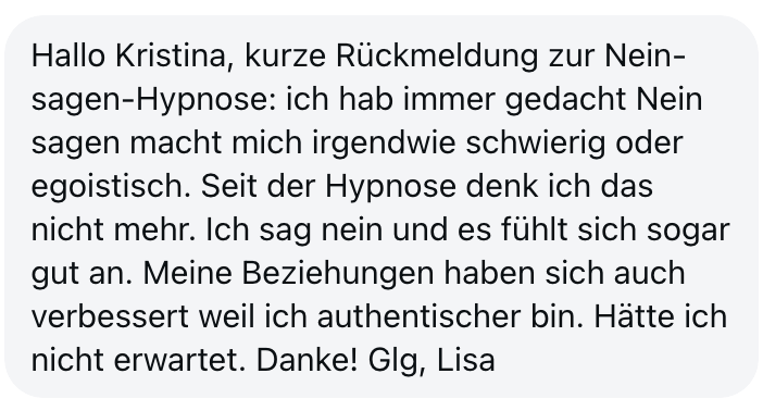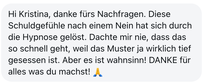 "Also wirklich Hut ab. Deine Online Hypnose Plattform ist sensationell geworden. Total übersichtlich alles, ganz einfach zu buchen, funktioniert einwandfrei, sogar für mich als technisches Nackerpatzi seht gut schaffbar. Und die Hypnosen sind natürlich gewohnte super Kristina-Qualität, da hab ich aber auch gar nichts anderes erwartet, ich hatte nur Respekt vor ONLINE, aber bin jetzt schon ein richtiger Fan. Sogar im Urlaub hab ich eine gemacht hihi, am Strand, so angenehm. Danke dir! Alles Liebe und bis bald!"
