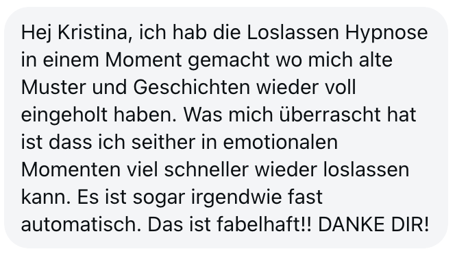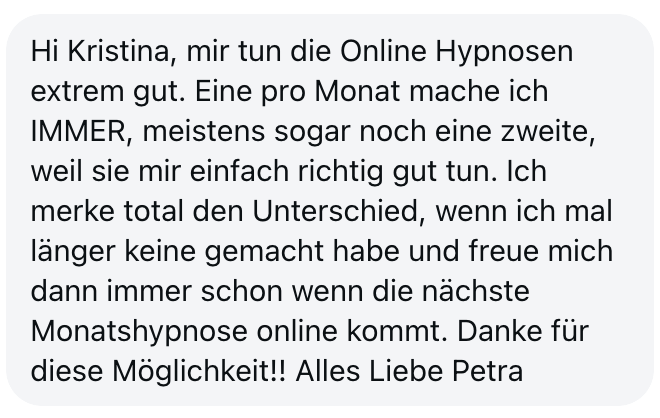 "Also wirklich Hut ab. Deine Online Hypnose Plattform ist sensationell geworden. Total übersichtlich alles, ganz einfach zu buchen, funktioniert einwandfrei, sogar für mich als technisches Nackerpatzi seht gut schaffbar. Und die Hypnosen sind natürlich gewohnte super Kristina-Qualität, da hab ich aber auch gar nichts anderes erwartet, ich hatte nur Respekt vor ONLINE, aber bin jetzt schon ein richtiger Fan. Sogar im Urlaub hab ich eine gemacht hihi, am Strand, so angenehm. Danke dir! Alles Liebe und bis bald!"
