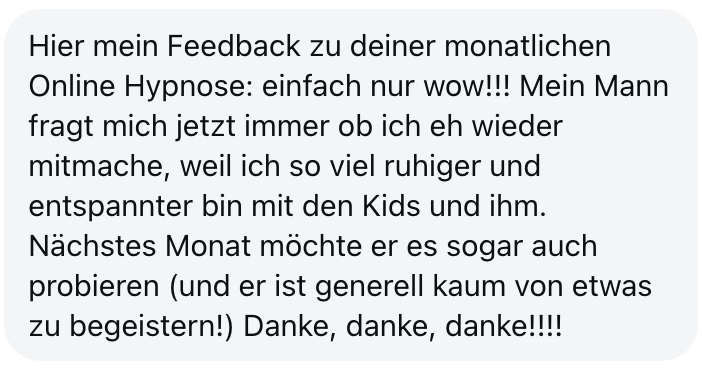 "Ich mache jetzt seit 4 Monaten 2 Online Hypnosen im Monat und fühl mich wie ein neuer Mensch. Ich bin viel entspannter und gelassener, unangenehme Dinge prallen an mir ab und ich fühle mich um Welten besser. Werde auf jeden Fall weiter machen mit den Hypnosen, vielen vielen Dank! LG"