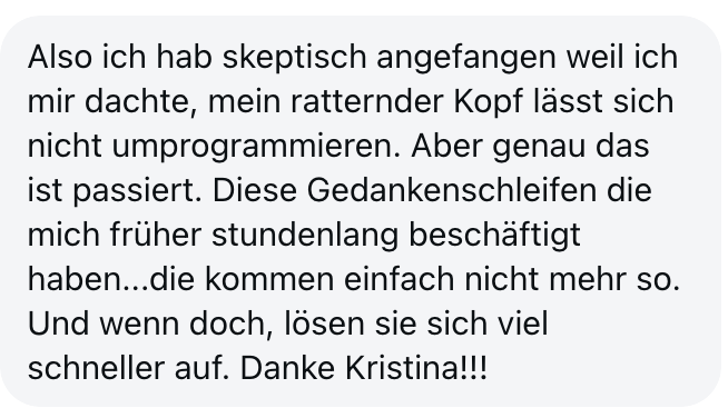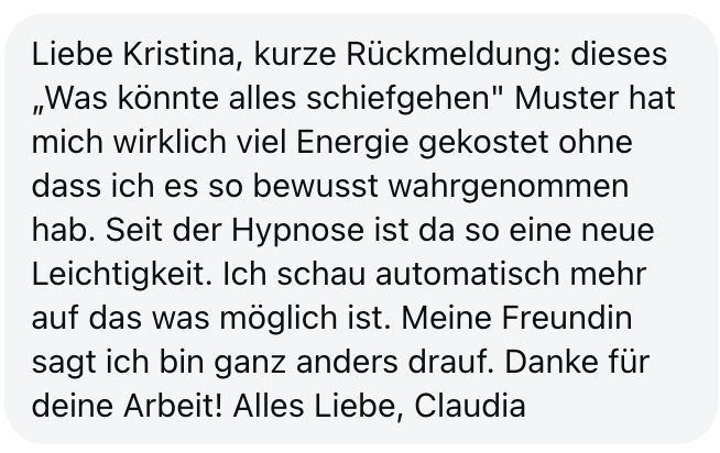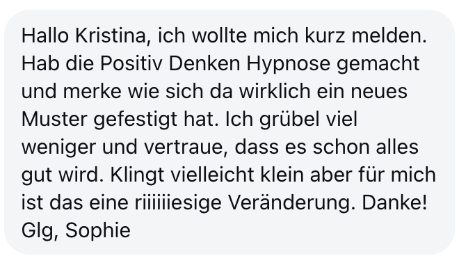 "Also wirklich Hut ab. Deine Online Hypnose Plattform ist sensationell geworden. Total übersichtlich alles, ganz einfach zu buchen, funktioniert einwandfrei, sogar für mich als technisches Nackerpatzi seht gut schaffbar. Und die Hypnosen sind natürlich gewohnte super Kristina-Qualität, da hab ich aber auch gar nichts anderes erwartet, ich hatte nur Respekt vor ONLINE, aber bin jetzt schon ein richtiger Fan. Sogar im Urlaub hab ich eine gemacht hihi, am Strand, so angenehm. Danke dir! Alles Liebe und bis bald!"
