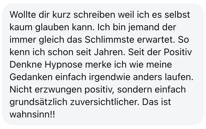 "Ich mache jetzt seit 4 Monaten 2 Online Hypnosen im Monat und fühl mich wie ein neuer Mensch. Ich bin viel entspannter und gelassener, unangenehme Dinge prallen an mir ab und ich fühle mich um Welten besser. Werde auf jeden Fall weiter machen mit den Hypnosen, vielen vielen Dank! LG"