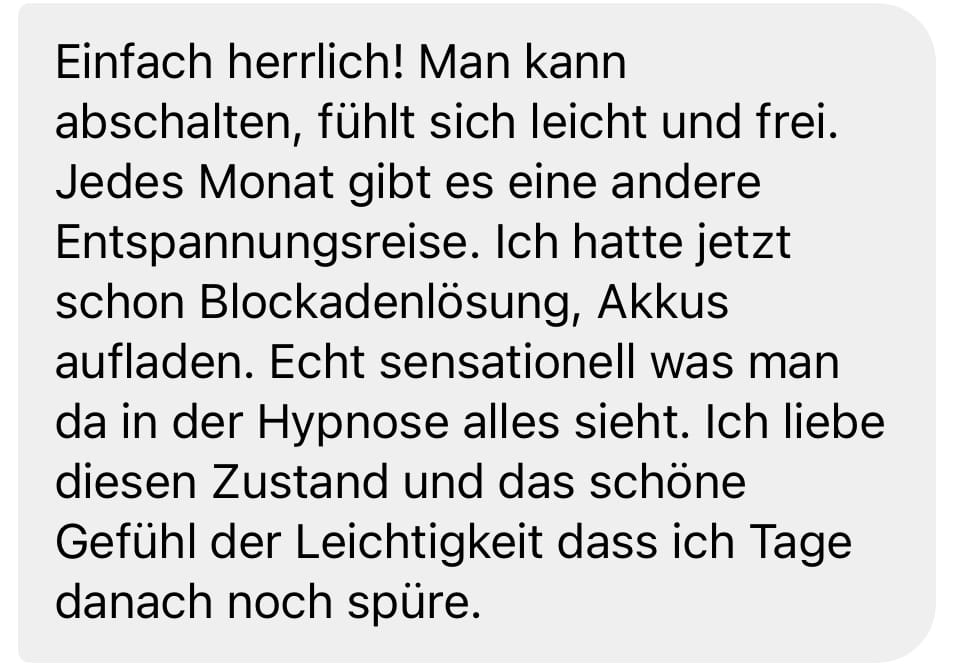 "Ich mache jetzt seit 4 Monaten 2 Online Hypnosen im Monat und fühl mich wie ein neuer Mensch. Ich bin viel entspannter und gelassener, unangenehme Dinge prallen an mir ab und ich fühle mich um Welten besser. Werde auf jeden Fall weiter machen mit den Hypnosen, vielen vielen Dank! LG"