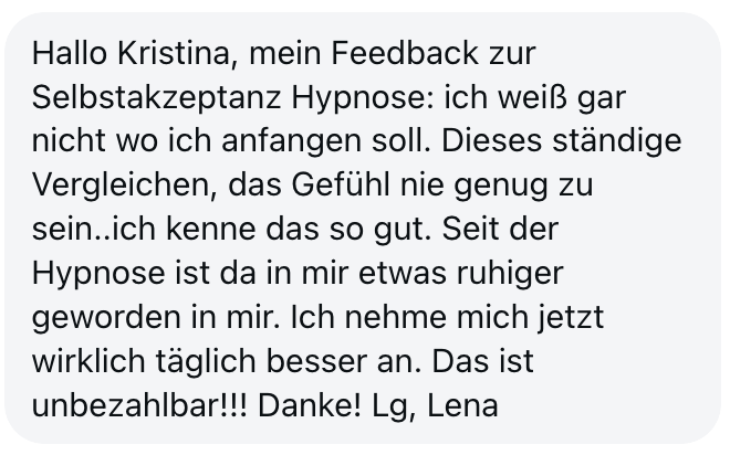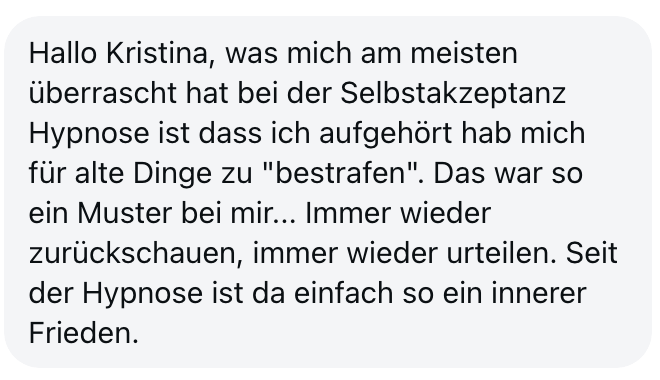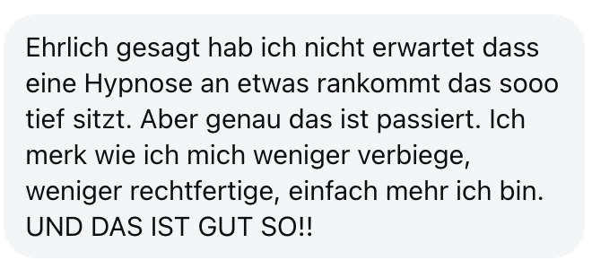 "Also wirklich Hut ab. Deine Online Hypnose Plattform ist sensationell geworden. Total übersichtlich alles, ganz einfach zu buchen, funktioniert einwandfrei, sogar für mich als technisches Nackerpatzi seht gut schaffbar. Und die Hypnosen sind natürlich gewohnte super Kristina-Qualität, da hab ich aber auch gar nichts anderes erwartet, ich hatte nur Respekt vor ONLINE, aber bin jetzt schon ein richtiger Fan. Sogar im Urlaub hab ich eine gemacht hihi, am Strand, so angenehm. Danke dir! Alles Liebe und bis bald!"