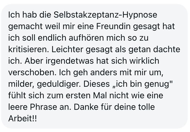 "Ich mache jetzt seit 4 Monaten 2 Online Hypnosen im Monat und fühl mich wie ein neuer Mensch. Ich bin viel entspannter und gelassener, unangenehme Dinge prallen an mir ab und ich fühle mich um Welten besser. Werde auf jeden Fall weiter machen mit den Hypnosen, vielen vielen Dank! LG"