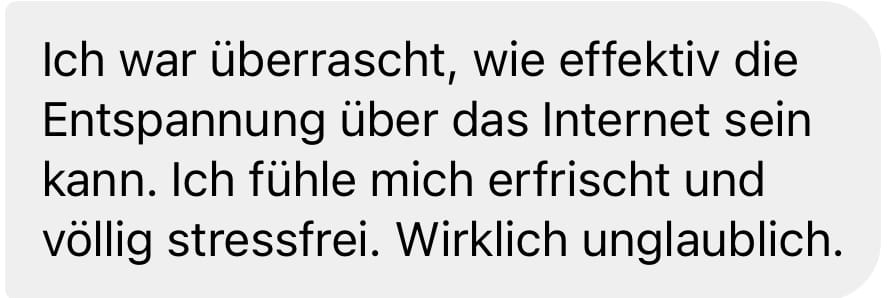 "Ich mache jetzt seit 4 Monaten 2 Online Hypnosen im Monat und fühl mich wie ein neuer Mensch. Ich bin viel entspannter und gelassener, unangenehme Dinge prallen an mir ab und ich fühle mich um Welten besser. Werde auf jeden Fall weiter machen mit den Hypnosen, vielen vielen Dank! LG"
