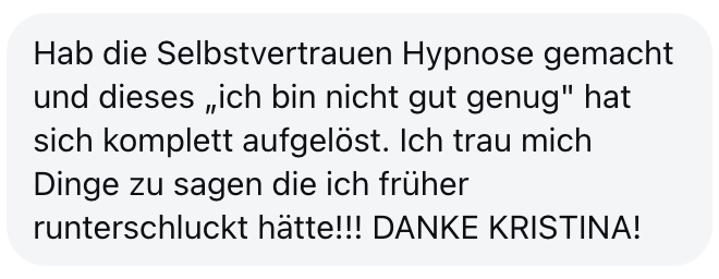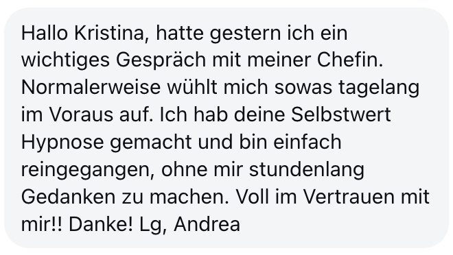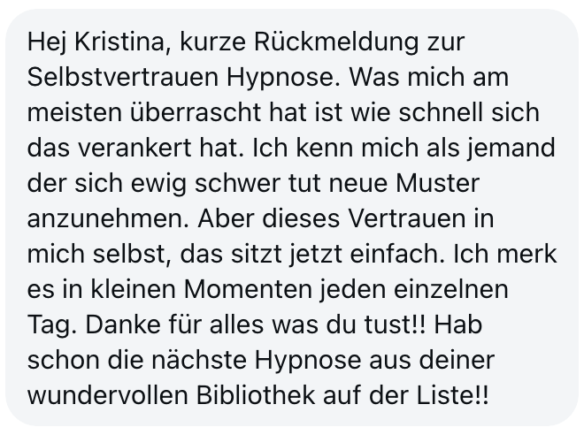 "Also wirklich Hut ab. Deine Online Hypnose Plattform ist sensationell geworden. Total übersichtlich alles, ganz einfach zu buchen, funktioniert einwandfrei, sogar für mich als technisches Nackerpatzi seht gut schaffbar. Und die Hypnosen sind natürlich gewohnte super Kristina-Qualität, da hab ich aber auch gar nichts anderes erwartet, ich hatte nur Respekt vor ONLINE, aber bin jetzt schon ein richtiger Fan. Sogar im Urlaub hab ich eine gemacht hihi, am Strand, so angenehm. Danke dir! Alles Liebe und bis bald!"