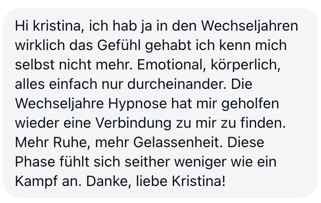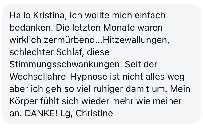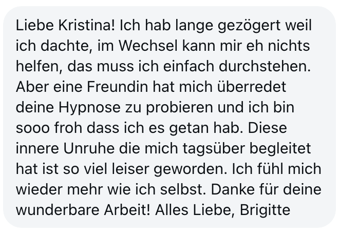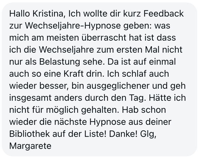 "Also wirklich Hut ab. Deine Online Hypnose Plattform ist sensationell geworden. Total übersichtlich alles, ganz einfach zu buchen, funktioniert einwandfrei, sogar für mich als technisches Nackerpatzi seht gut schaffbar. Und die Hypnosen sind natürlich gewohnte super Kristina-Qualität, da hab ich aber auch gar nichts anderes erwartet, ich hatte nur Respekt vor ONLINE, aber bin jetzt schon ein richtiger Fan. Sogar im Urlaub hab ich eine gemacht hihi, am Strand, so angenehm. Danke dir! Alles Liebe und bis bald!"